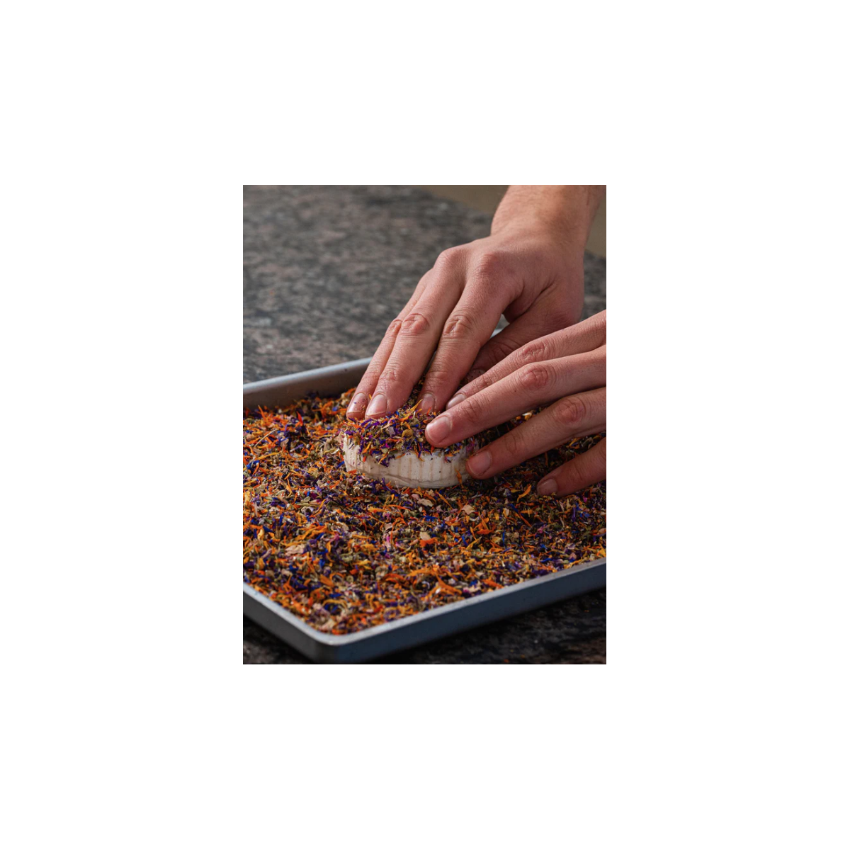Formetta a base di anacardi fermentati rivestita con fiori eduli essiccati (malva, rosa canina, fiordaliso, calendula): estetica scenografica e profumo floreale.