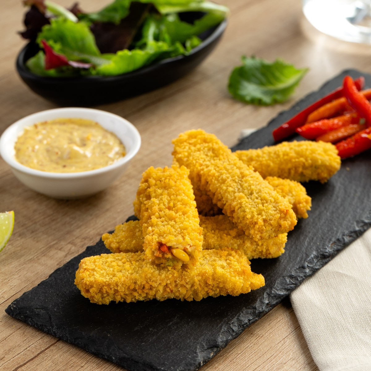 Ingredienti: acqua, 17% preparato vegetale a base di olio di cocco (acqua, olio di cocco, amido, amido modificato, aromi, sale iodato, coloranti: estratto di peperoncino, caroteni), 14% proteine di piselli testurizzate, olio di girasole, olio di cocco, 2,6% proteine di fave, 1,8% proteine di piselli, stabilizzante (metilcellulosa), amido, sale, sciroppo di glucosio, aromi (contiene estratto di lievito), spezie (cipolla, aglio, pepe), antiossidanti (acido ascorbico, acido citrico), estratti di spezie, conservante (aceto tamponato), estratti vegetali con funzione colorante (succo di barbabietola concentrato, estratto di orzo maltato), vitamina B12, ferro, zinco.