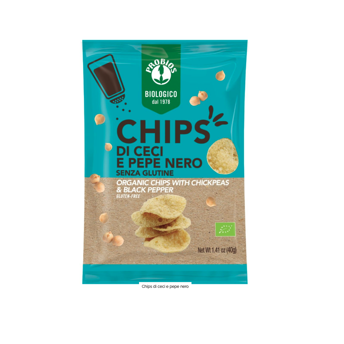 Le Chips di Ceci e Pepe Nero Probios sono uno snack innovativo e leggero, realizzato con ingredienti semplici e genuini. Croccanti e irresistibili, rappresentano una valida alternativa alle classiche patatine: preparate con farina di ceci biologica (42,6%), arricchite dal gusto deciso del pepe nero e cotte con olio di girasole, senza olio di palma.